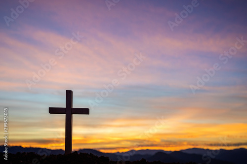 Silhouette cross on mountain at sunset background.Crucifixion Of Jesus Christ