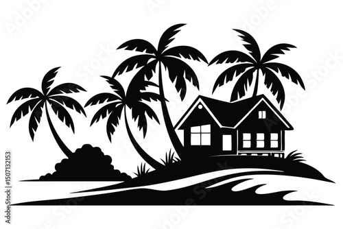 Silhouette of a Beach House on an Island with Palm Trees and Waves