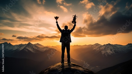 Silhouette of a businessman holding a trophy on top of a mountain, Business and success concept