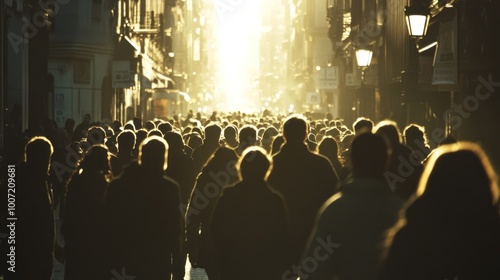 Silhouette of a crowd walking down a city street with the sun shining through the buildings.