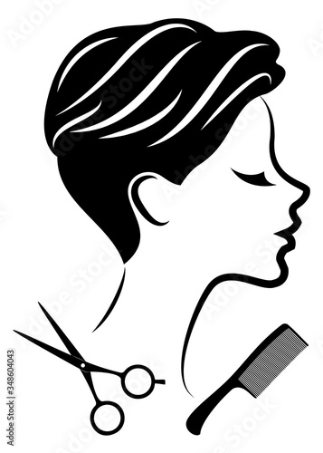 Silhouette of a cute lady. The girl shows a hairstyle on medium and short hair and scissors. Suitable for logo, hairdresser advertising. Vector illustration