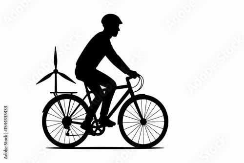 Silhouette of a cyclist wearing a helmet riding a bicycle with a small wind turbine attached to the back rack promoting green energy and sustainable