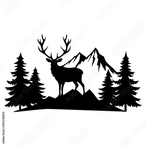 Silhouette of a deer with antlers standing in front of mountains and pine trees