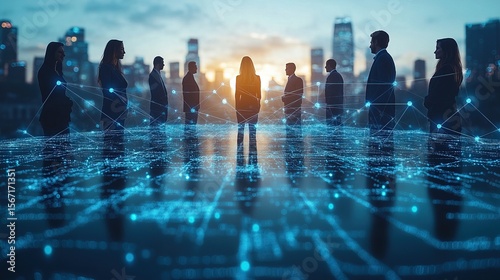 Silhouette of a diverse group of people standing in a city, connected by a digital network overlay