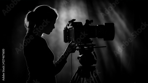 Silhouette of a Female Videographer Operating a Professional Camera