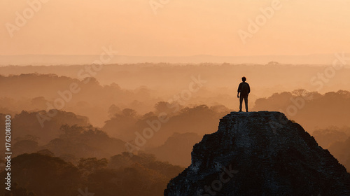 Silhouette of a figure standing atop a stone structure, gazing over a hazy, expansive forest at sunrise. Evokes adventure, exploration, and discovery. Perfect for travel, inspiration, or achievement.