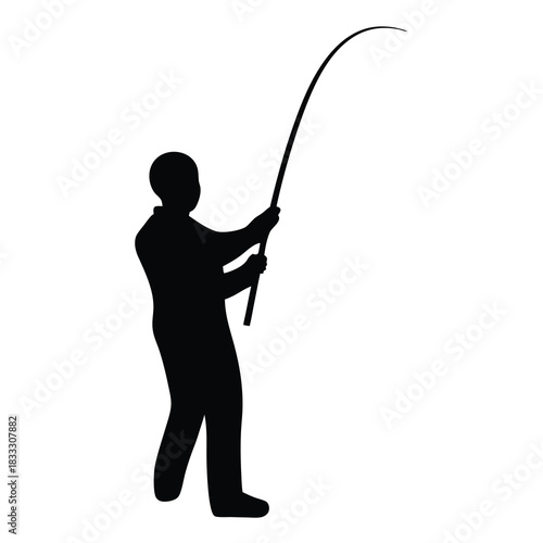 Silhouette of a fisherman holding a fishing rod and catching a fish