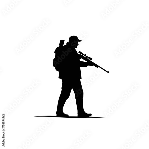Silhouette of a hunter with rifle and backpack walking with determination outdoors symbolizing outdoor activities silhouette flat design vector illustration white background
