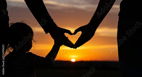 Silhouette of a loving family, parents and young child, holding hands and forming a heart shape against a vibrant sunset. Symbol of love, togetherness, and family bonds.