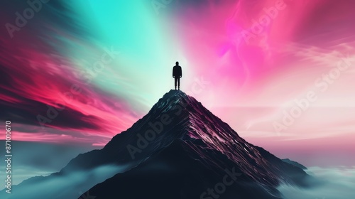 Silhouette of a man on a mountain peak under a starry sky, cosmic hues, fantasy, digital painting, conveying the vastness and wonder of the universe