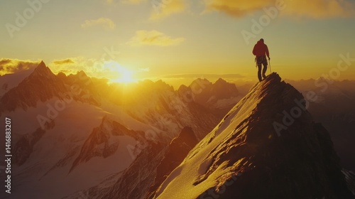 Silhouette of a Mountaineer on a Snowy Peak at Sunset