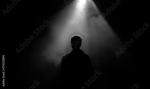 Silhouette of a Person Illuminated by a Spotlight in Darkness.