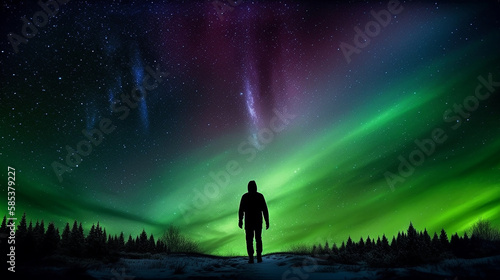 silhouette of a person in a forest, Man walking away. northern lights galaxies surreal. Generative Ai