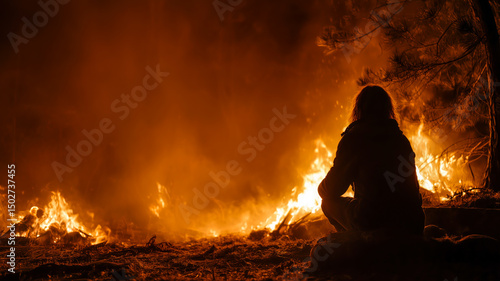 Silhouette of a person sitting in front of a raging fire in a dark landscape, contemplation amidst the flames.