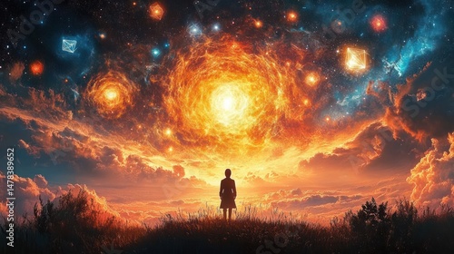 Silhouette of a person standing on grass facing a fiery glowing swirling celestial sky filled with bright stars and geometric light shapes in vibrant orange and blue hues