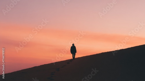 Silhouette Of A Person Walking On A Sand Dune At Sunset. Solitude And Reflection In Nature