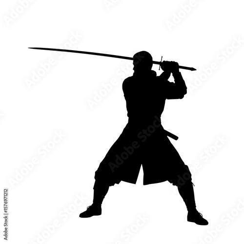 Silhouette of a samurai holding a sword in a battle stance on a transparent background