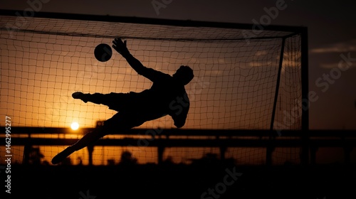 Silhouette of a soccer player diving to catch a ball at sunset.
