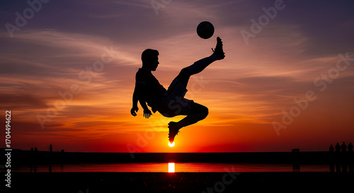 Silhouette of a soccer player performing a bicycle kick against a vibrant sunset over a calm lake