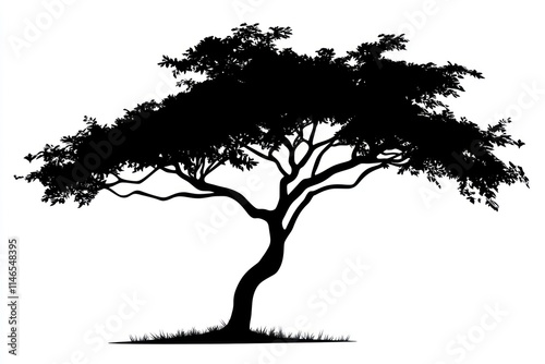 Silhouette of a sprawling tree with a curved trunk against a white background.