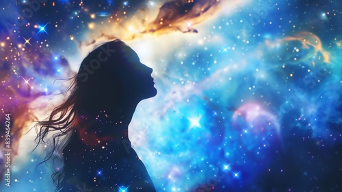 Silhouette of a woman against a vibrant cosmic background, evoking a sense of wonder and connection to the universe.