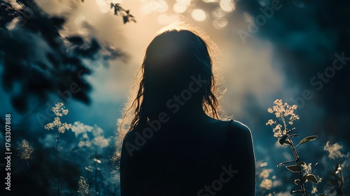 Silhouette of a woman in a forest with sunbeams filtering through the trees.