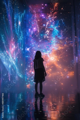 Silhouette of a Woman in Front of a Vibrant Digital Art Installation with Cosmic and Nebula Themes