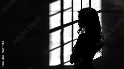 Silhouette of a woman standing by a window, arms crossed, in a dark room.