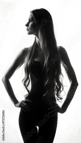 Silhouette of a woman with long hair posing confidently in high heels against white background
