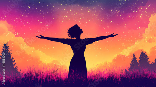 Silhouette of a woman with outstretched arms against the background of a beautiful sky and dawn or sunset, a banner of harmony and happiness and summer mood. Dawn. Illustration