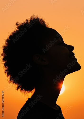 Silhouette of a young woman with curly hair, facing towards the right side of the image. she is wearing a black t-shirt and her hair is styled in an afro.