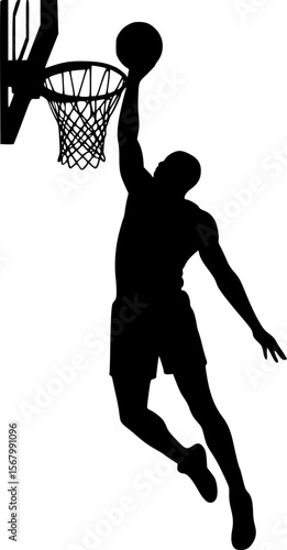 Silhouette of Basketball Player Dunking the Ball into the Hoop, Black and White Art