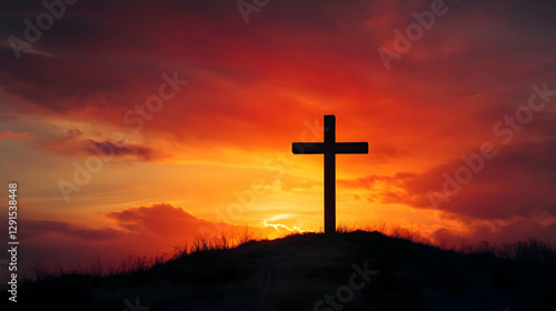 Silhouette of christian cross against vibrant sunset, symbolizing faith and hope