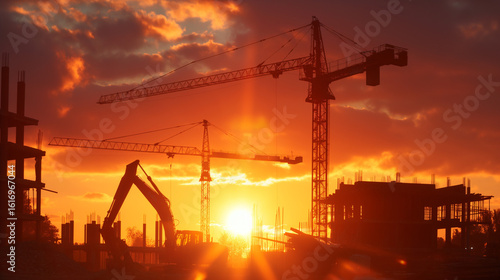 Silhouette of cranes and excavators at construction site during sunset, dramatic orange sky, industrial machinery in shadows, moody and cinematic style, wide angle composition
