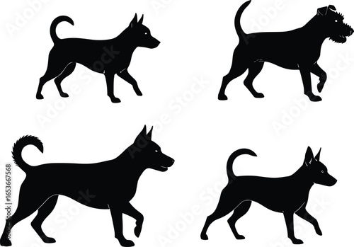 Silhouette of different dog breeds, walking dogs, pet animal design, black dog vector, domestic pets, canine illustration, animal silhouette