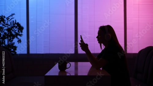 Silhouette of girl sitting at the food bistro bar at night in neon light, wearing headphones, listening music.