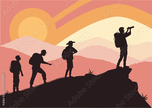 Silhouette of hikers on mountain ridge with sunset adventure and exploration concept