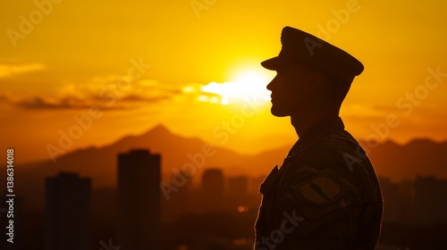 Silhouette of male soldier in uniform at sunset with mountain skyline