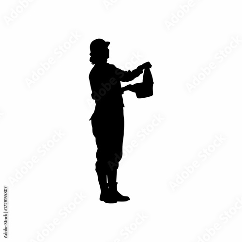 Silhouette of poultry worker checking birds during rain isolated on white background