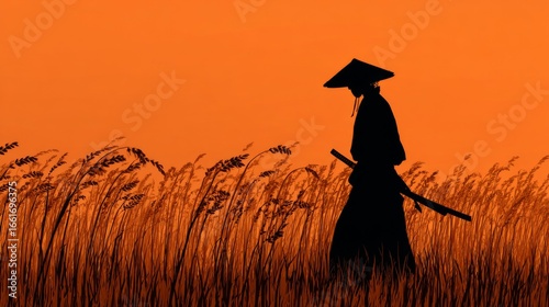 Silhouette of samurai walking through tall grass at sunset in orange backdrop.