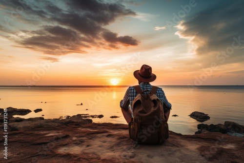 Silhouette of Solo Traveler Enjoying Sunset by the Sea in Asia. Wanderlust Adventure of Unrecognizable Backpacker with Summer Holiday Vibes