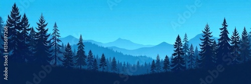 Silhouette of tall forest trees against a blue sky, peaceful atmosphere, blue silhouettes of trees,