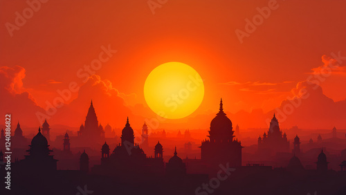 Silhouette of temples during sunset or sunrise orange and red sky background for religious poster, banner, shivratri, mahashivratri, Mahakumbh,2025, kumbh mela.