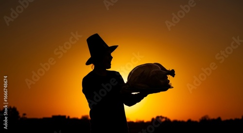 Silhouette of thanksgiving celebrant with turkey against a sunset backdrop