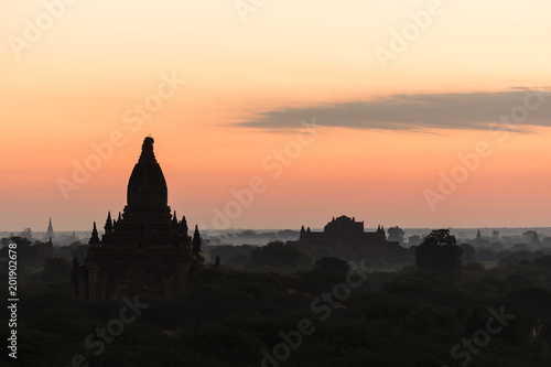 Silhouette of the ancient temples in the archaeological park in Bagan before the sunrise, Myanmar