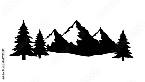 Silhouette of three mountains with snow caps and three pine trees in a black and white landscape scene