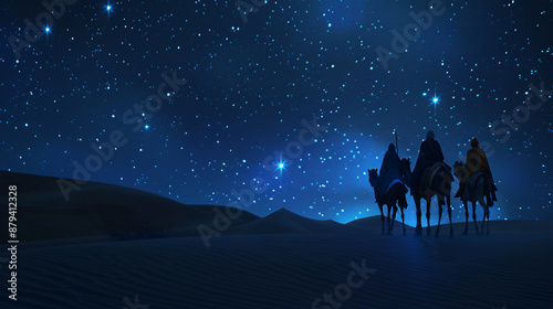 Silhouette of three wise men riding camels under a starry night sky