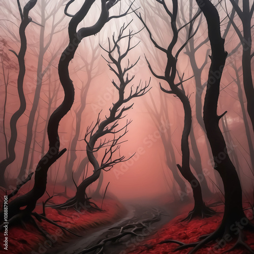 Silhouette of Twisted Branches in Red Foggy Forest, Creating Eerie Scene for Horror Themes and Imagery.