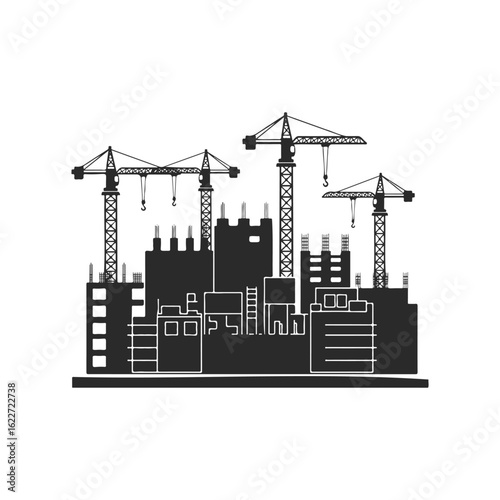 Silhouette of urban construction scene with tower cranes and buildings