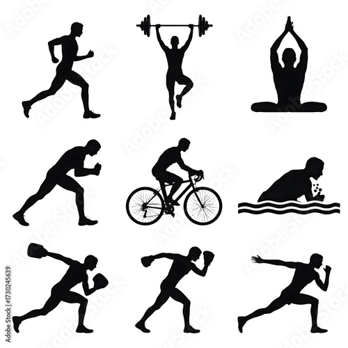 Silhouette of various sports activities isolated on transparent background, featuring running, weightlifting, yoga, boxing, swimming, cycling, and sprinting in a dynamic composition